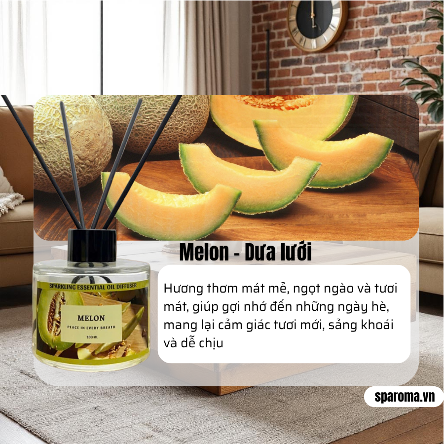 - Dưa Lưới: Hương thơm mát mẻ, ngọt ngào và tươi mát, giúp gợi nhớ đến những ngày hè, mang lại cảm giác tươi mới, sảng khoái và dễ chịu