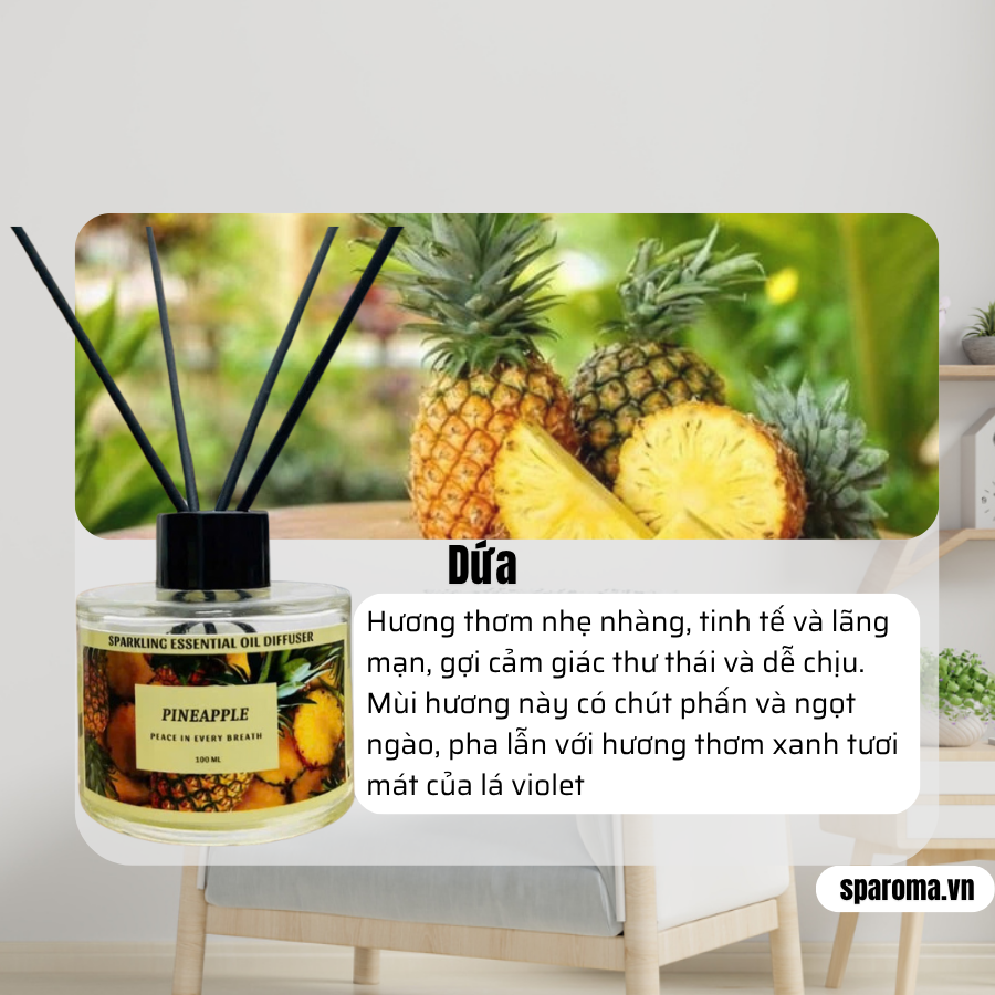 - Dứa: mùi thơm ngọt ngào, tươi mát và hơi chua nhẹ đặc trưng của quả dứa, mang lại cảm giác thư giãn và sảng khoái.