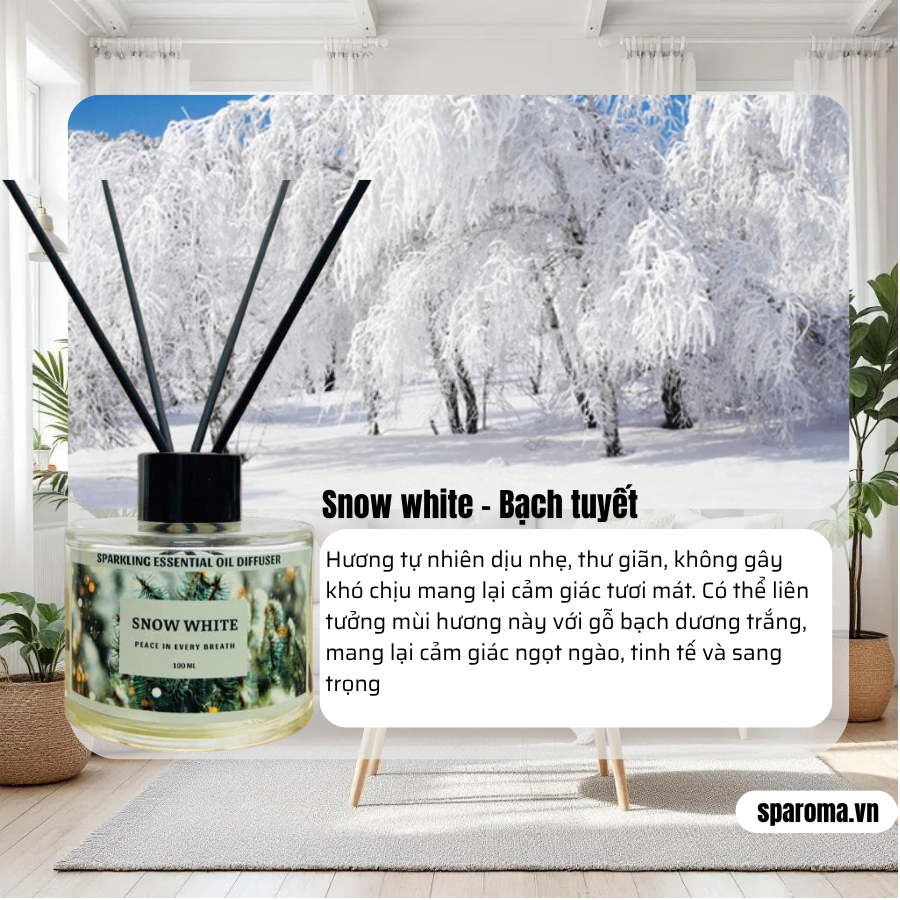 - Snow white: Hương tự nhiên dịu nhẹ, thư giãn, không gây khó chịu mang lại cảm giác tươi mát. Có thể liên tưởng mùi hương này với gỗ bạch dương trắng, mang lại cảm giác ngọt ngào, tinh tế và sang trọng